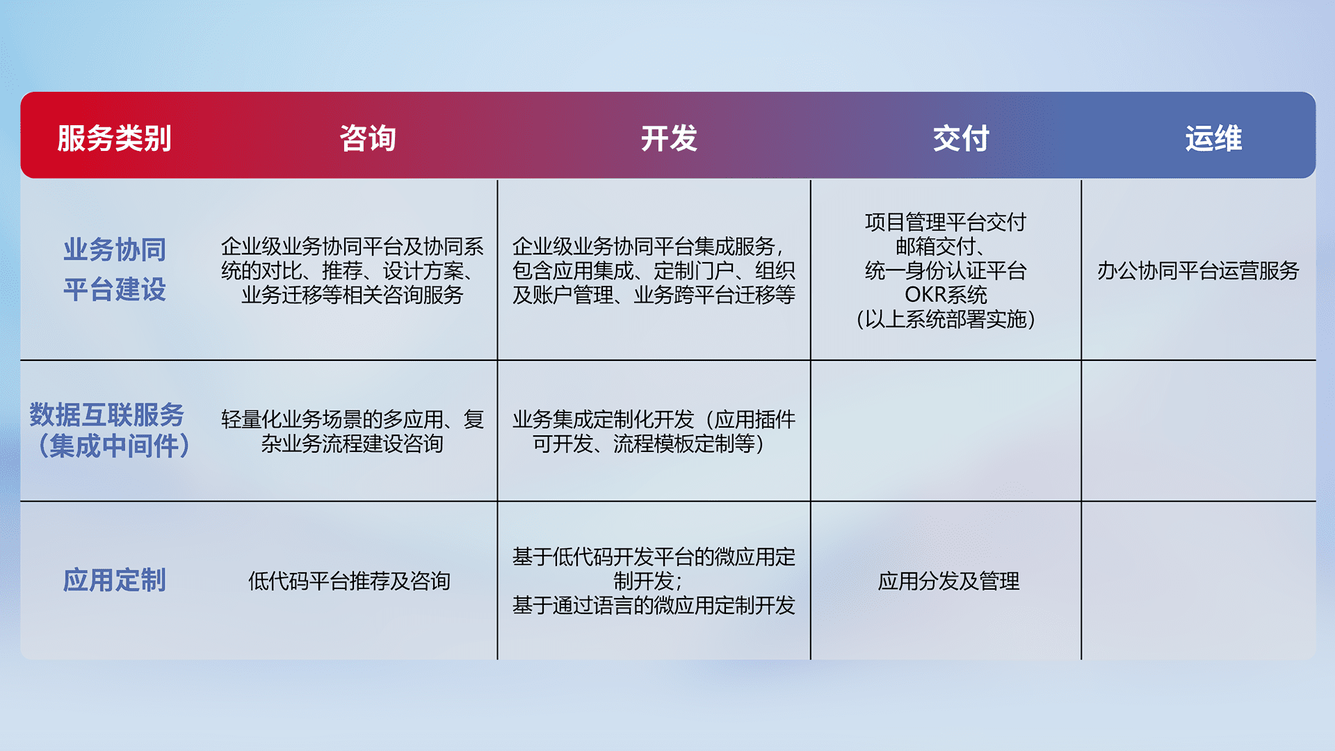 针对钉钉、、、、企微、、IDaas等平台级产品提供产品的规划、、、方案、、、交付、、、、定制化开发等服务,,实现如统一协同办公、、智能客户服务、、、、混合会议管理、、、、智能数据查询、、、、等业务场景,,,,实现数字化转型。。