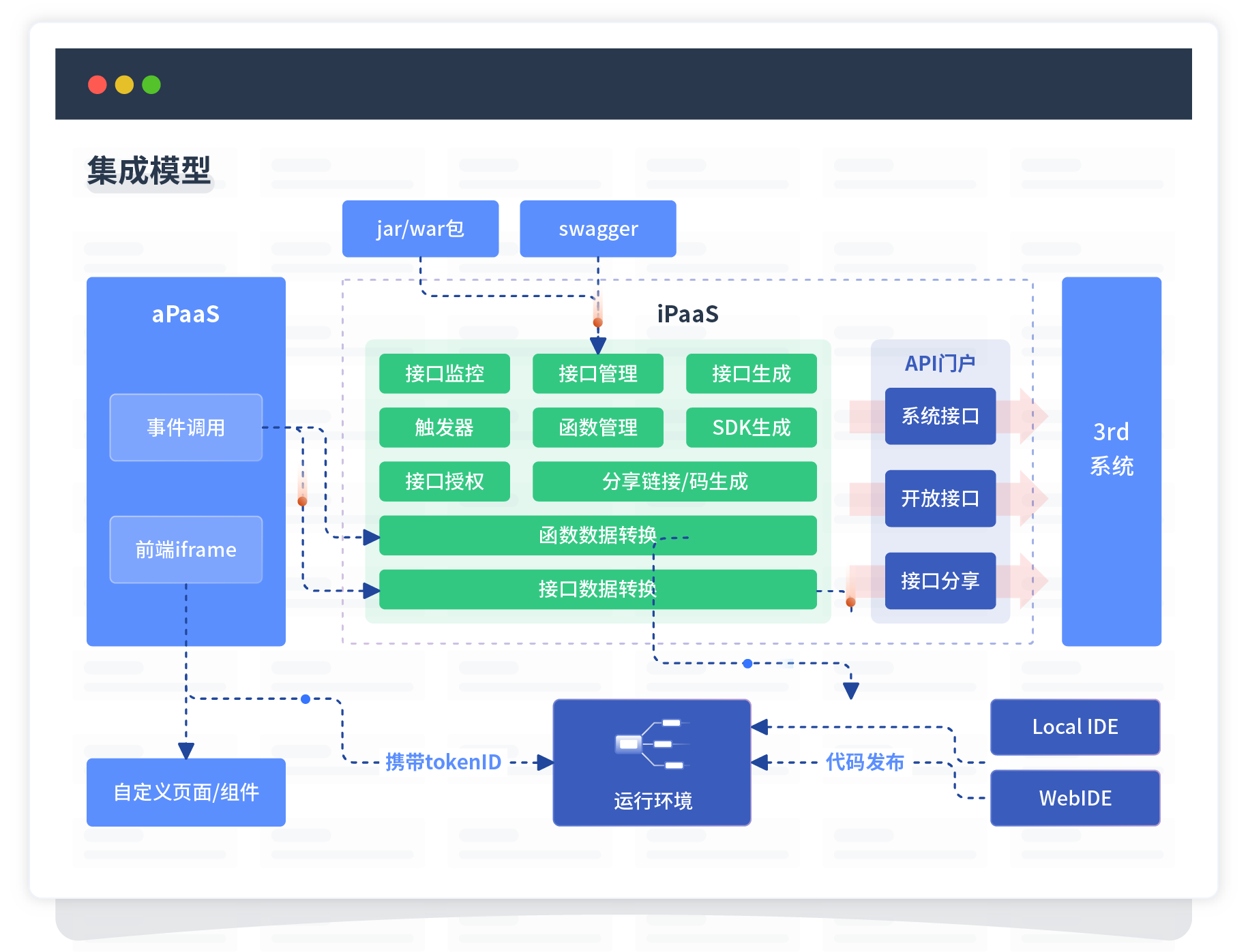 集成模型包括平台本身前、、、、、、、、后端能力的扩展,,,,,,,,,,,,,也支持通过API门户和第三方系统进行交互。。。。。。