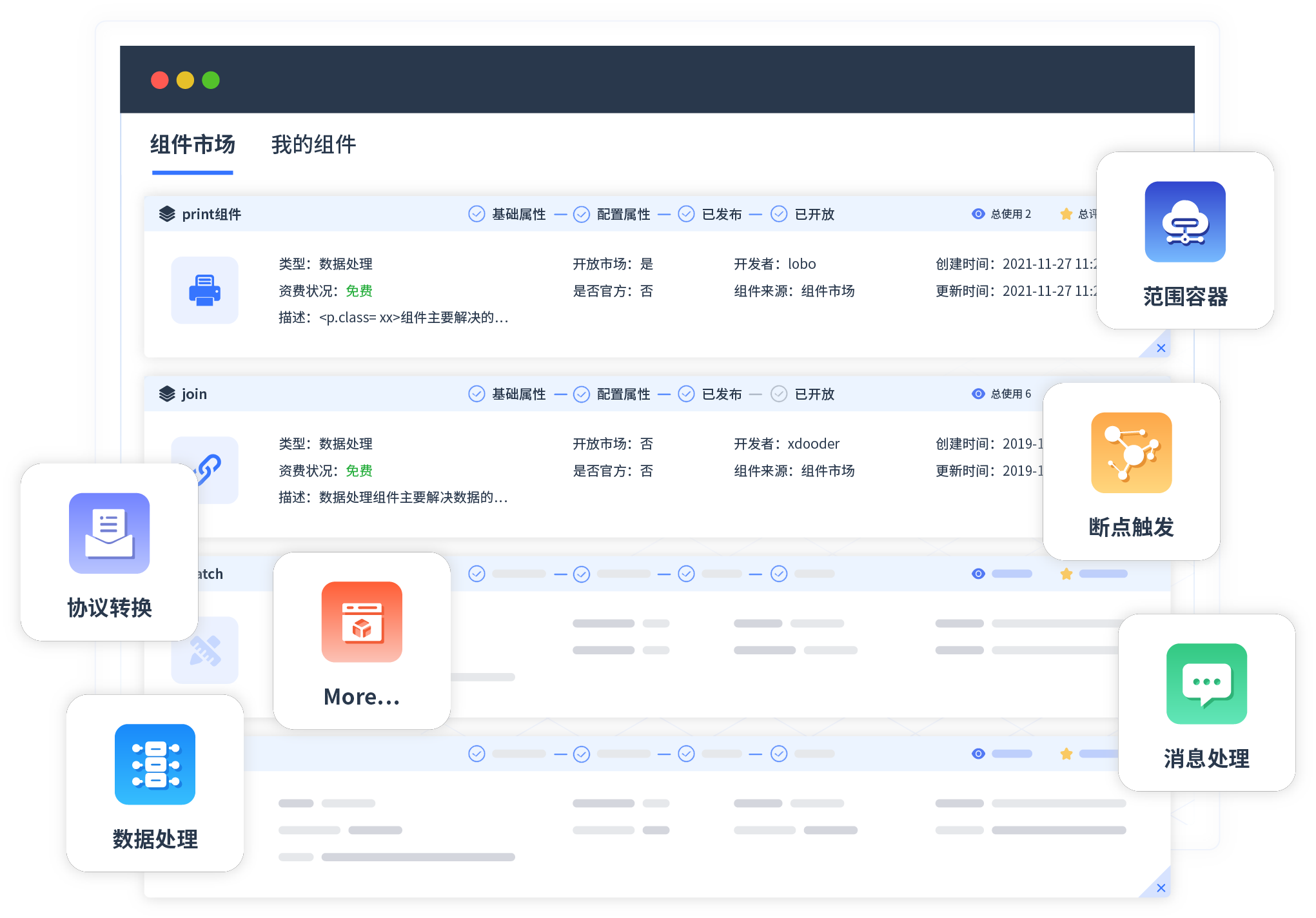 针对集成场景,,,,,,,,NO钱包提供组件市场,,,,,,,,,例如协议转换、、、、、、消息处理、、、、文件操作等。。。。。。。。。除平台提供的组件外,,,,,,,,,客户可以自定义所需组件。。。。。。。