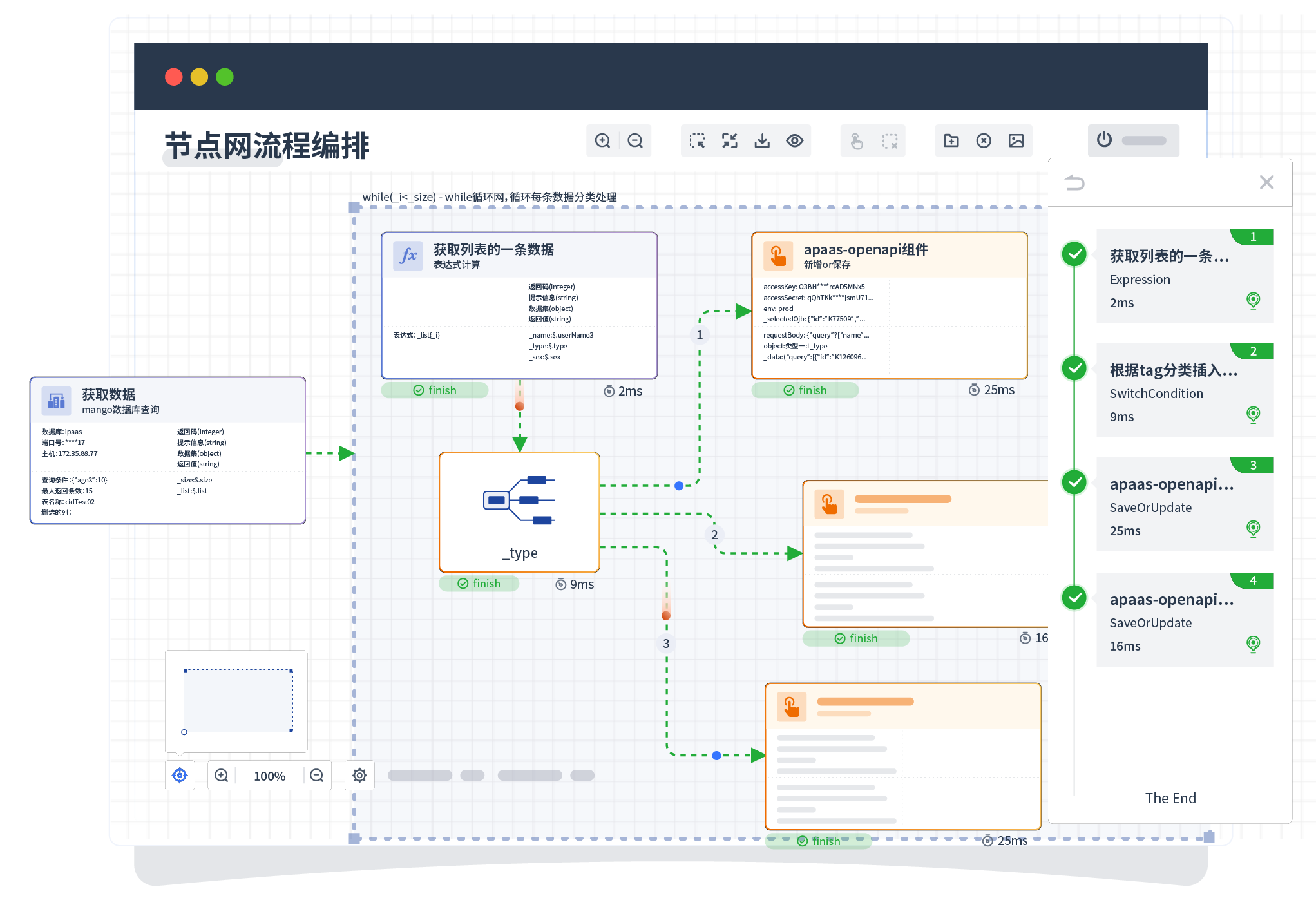 针对集成场景,,,,,,,组件定义后支持进行流程编制,,,,,,,,,,,,不同于传统代码方式,,,,,,,,通过图形化展示,,,,,,,支持在线调试、、、、、日志查看和运行回放。。。。。。。。