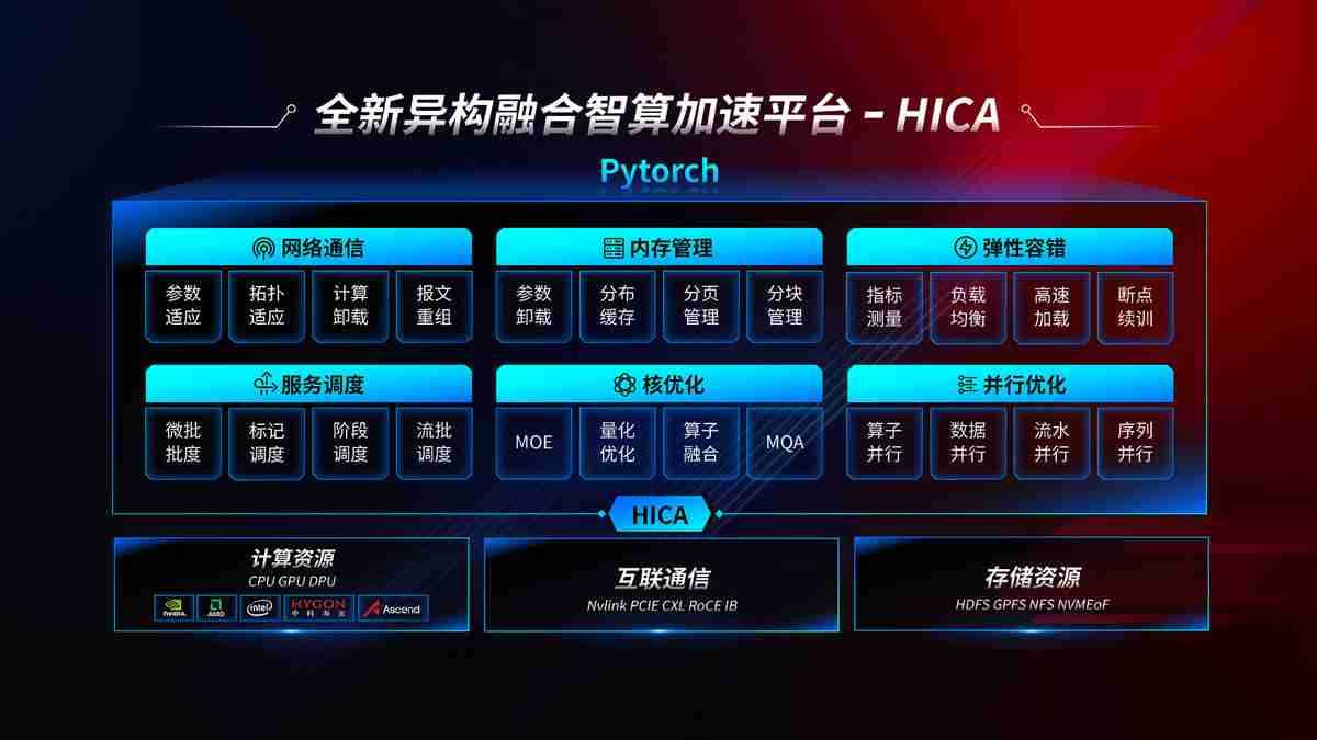 通过自研的服务层、、、中间适配层、、、、以及调度编排算法,,,采用数据并行、、、模型并行等多种并行方式,,把并行计算任务进行有效的分解,,使其分别由相应的软件栈和算力资源来承接。。。当GPU资源变化,,,,HICA可以实时动态调度计算子任务并调整模型拓扑和架构,,,以充分聚合各种算力资源。。
