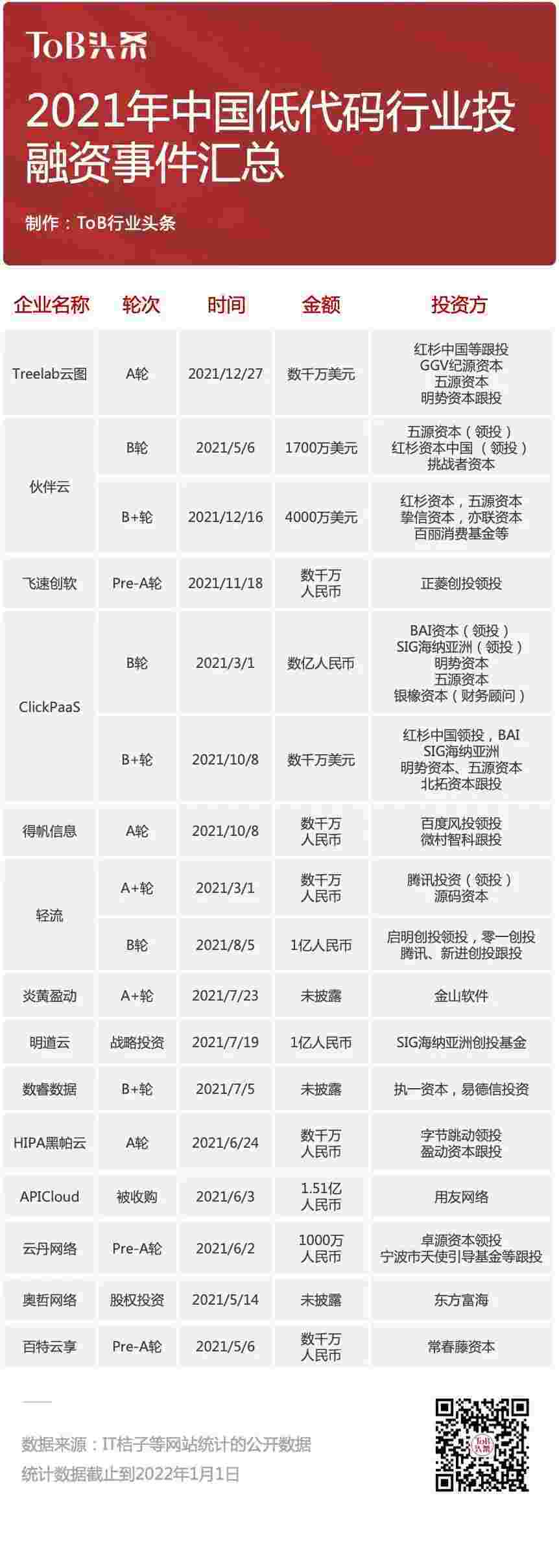 到2021年,,,,,,无/低代码投融资规模势头更甚,,,,,,,,,,,,,,其中包括轻流两轮融资(A+轮数千万人民币,,,,,,,,,,,,B轮近亿人民币)、、、、、、、、、NO钱包 两轮融资(B轮数亿人民币,,,,,,,,,B+轮数千万美元)、、、、、、、、百特云享数千万元Pre-A轮融资......