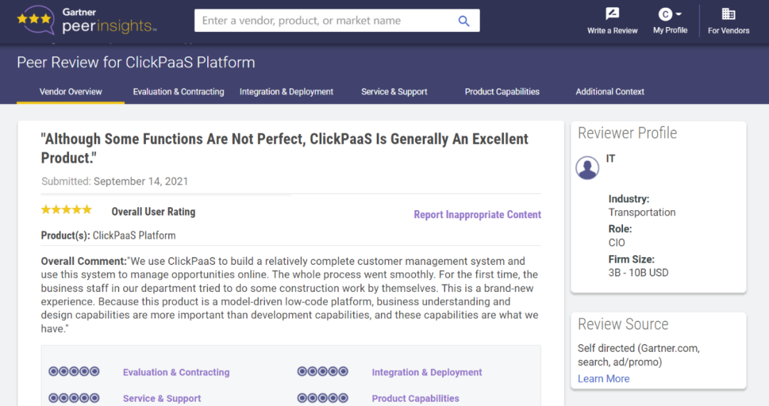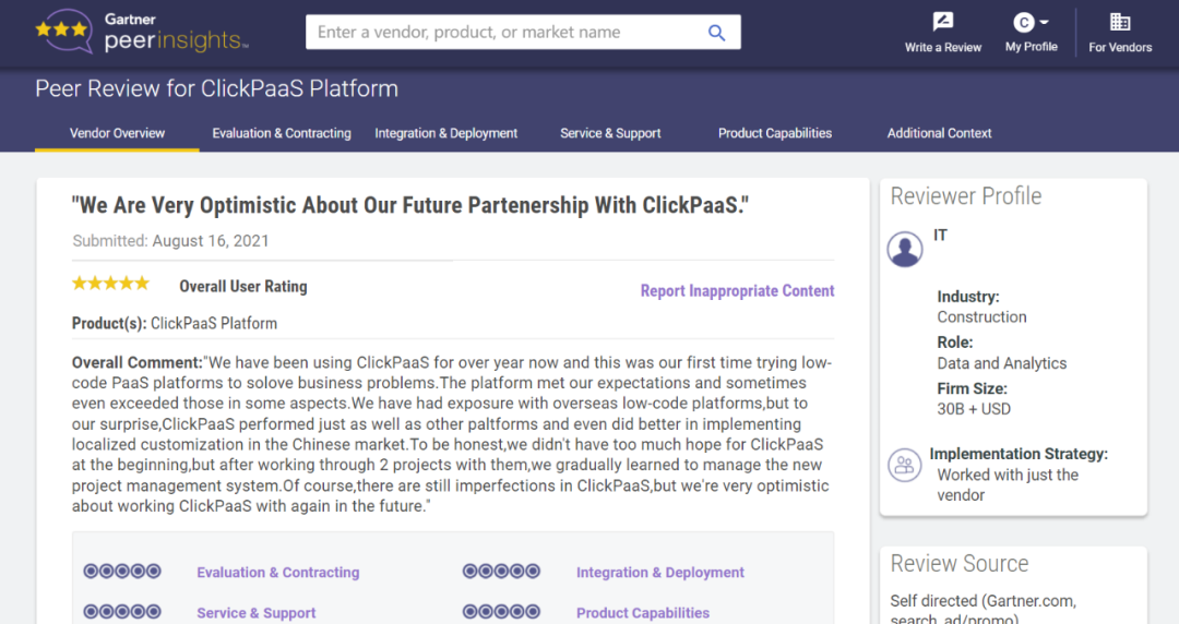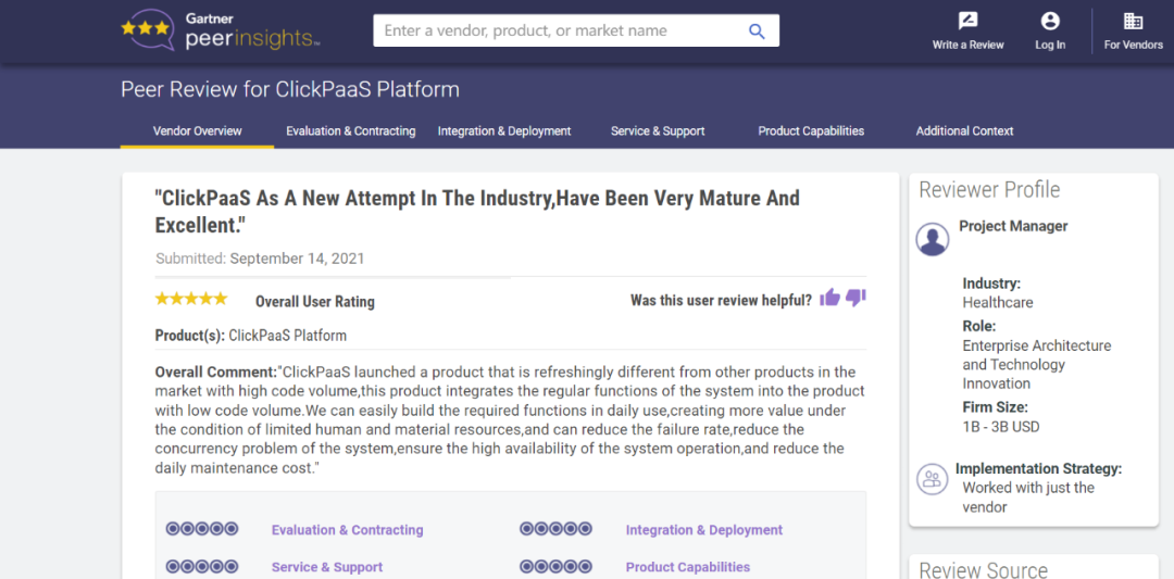 Tips:::::::::::【Peer Insights】——用户对企业IT产品和服务发布真实评价的平台。。。。。。。。。。。。。。目前已有355个市场,,,,,,,255,000条经过验证的评价。。。。。。。。。。。每一条评价Gartner会针对参评企业营收规模及参评人员信息做验证、、、、、、、、、评价内容做多维核实。。。。。。