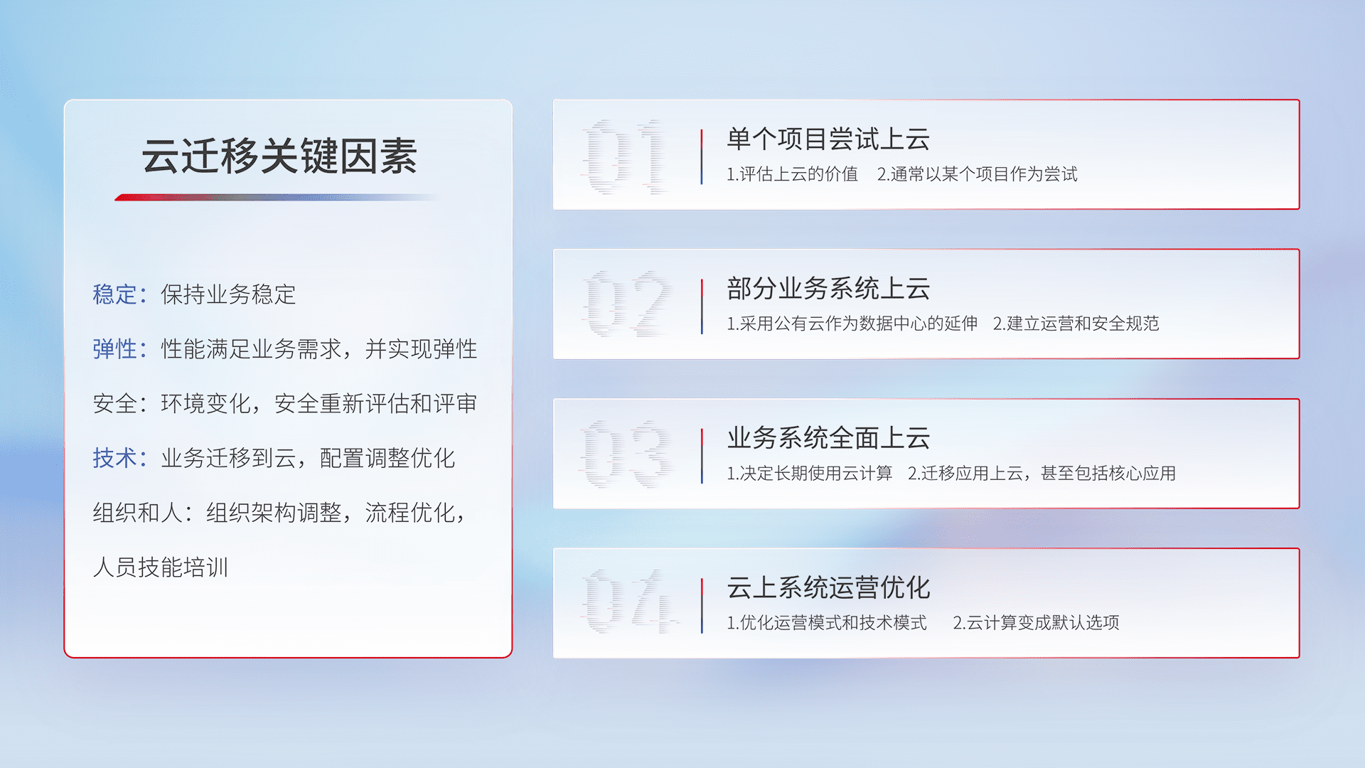 结合实际业务,,,,从规划设计、、云平台选型、、云原生改造、、数据迁移、、、集成交付,,迁移全过程为客户识别最佳上云路径,,,,做好风险识别管理,,,设计网络架构、、、、身份权限、、安全审计合规、、操作审计、、、日志审计、、、监控告警策略、、多站点容灾设计等,,对云上基础设施进行整体规划,,,,提升IT治理水平,,以满足弹性、、、、高可用、、高性能的需求。。。