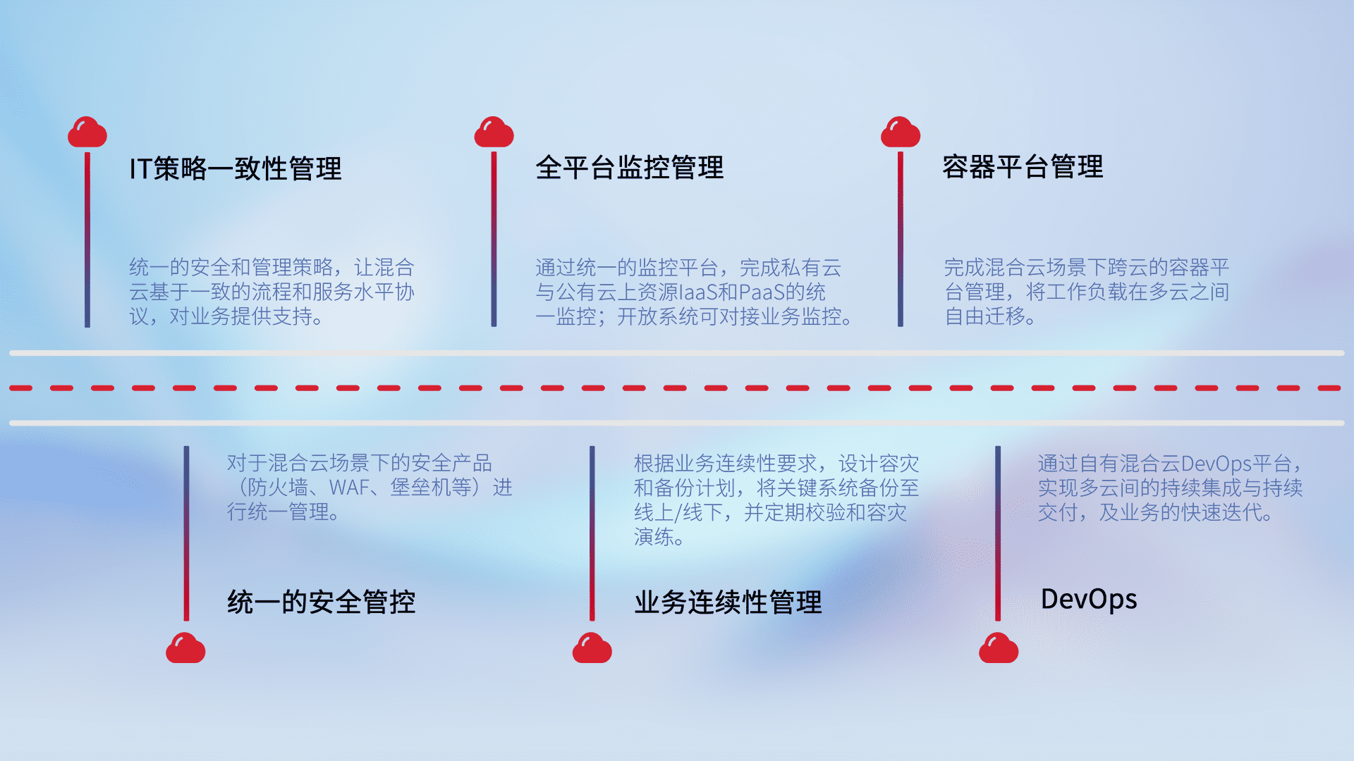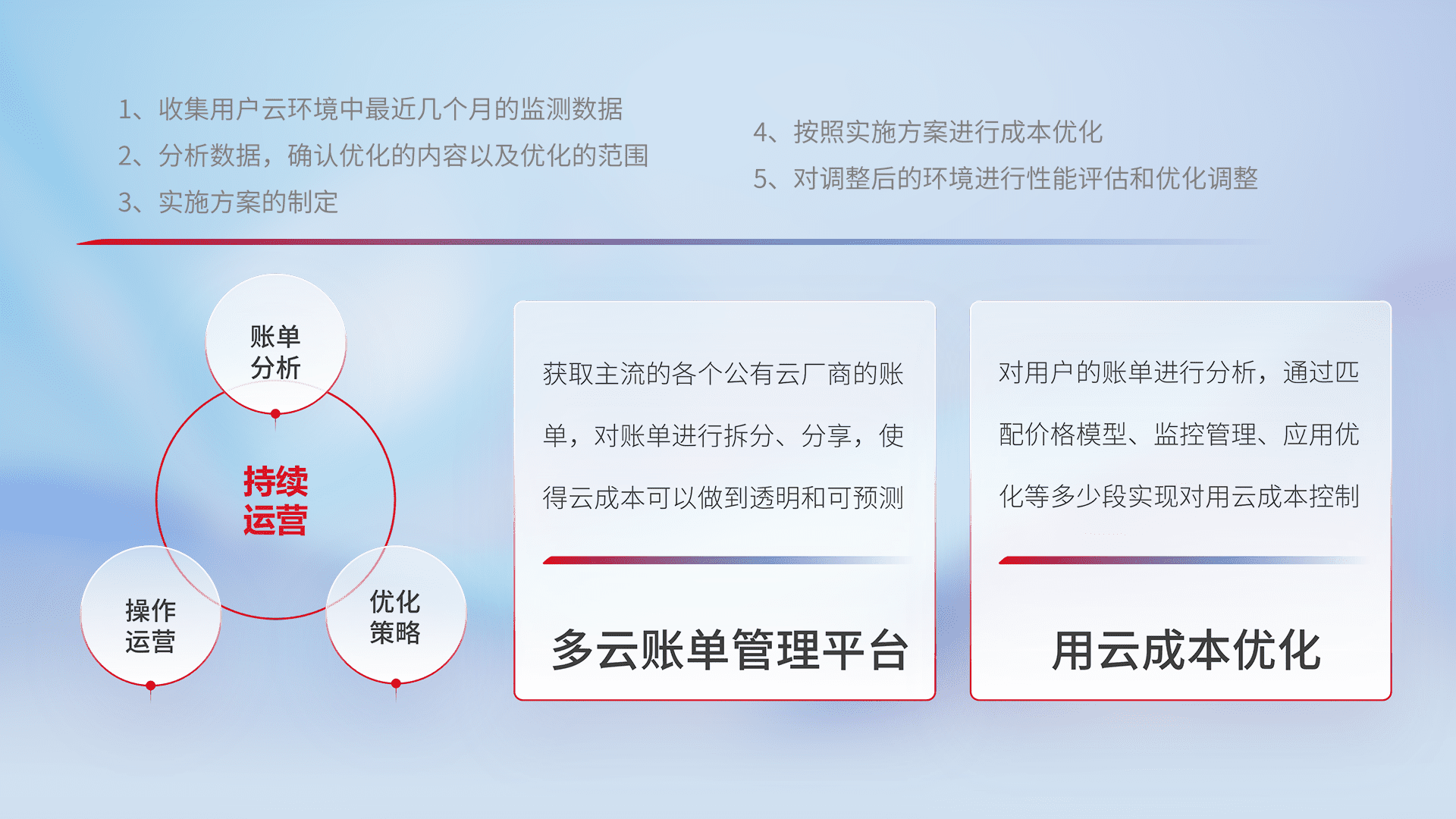通过多云纳管,,以统一的资源数据模型把客户的云资源进行抽象和封装,,,进而实现对多云资源的统一操作,,,保障云资源管理的可靠性、、稳定性与可用性。。。量身定制化运维内容,,,,配置、、开发运维、、补丁管理、、备份、、监控、、认证和访问管理、、审计和日常巡检等,,,,保障在用云过程中的可靠度,,,稳定度以及高可用率。。。。