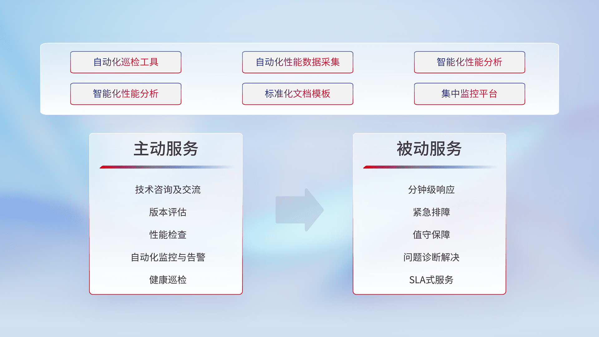 智能化工具和标准化文档,,,保障服务质量,,提供主动服务(包含技术咨询、、版本评估、、、、性能检查、、自动化监控与告警、、、、健康巡检)和被动服务包含(分钟级响应、、紧急排障、、、值守保障、、问题诊断解决、、、、SLA服务)。。。